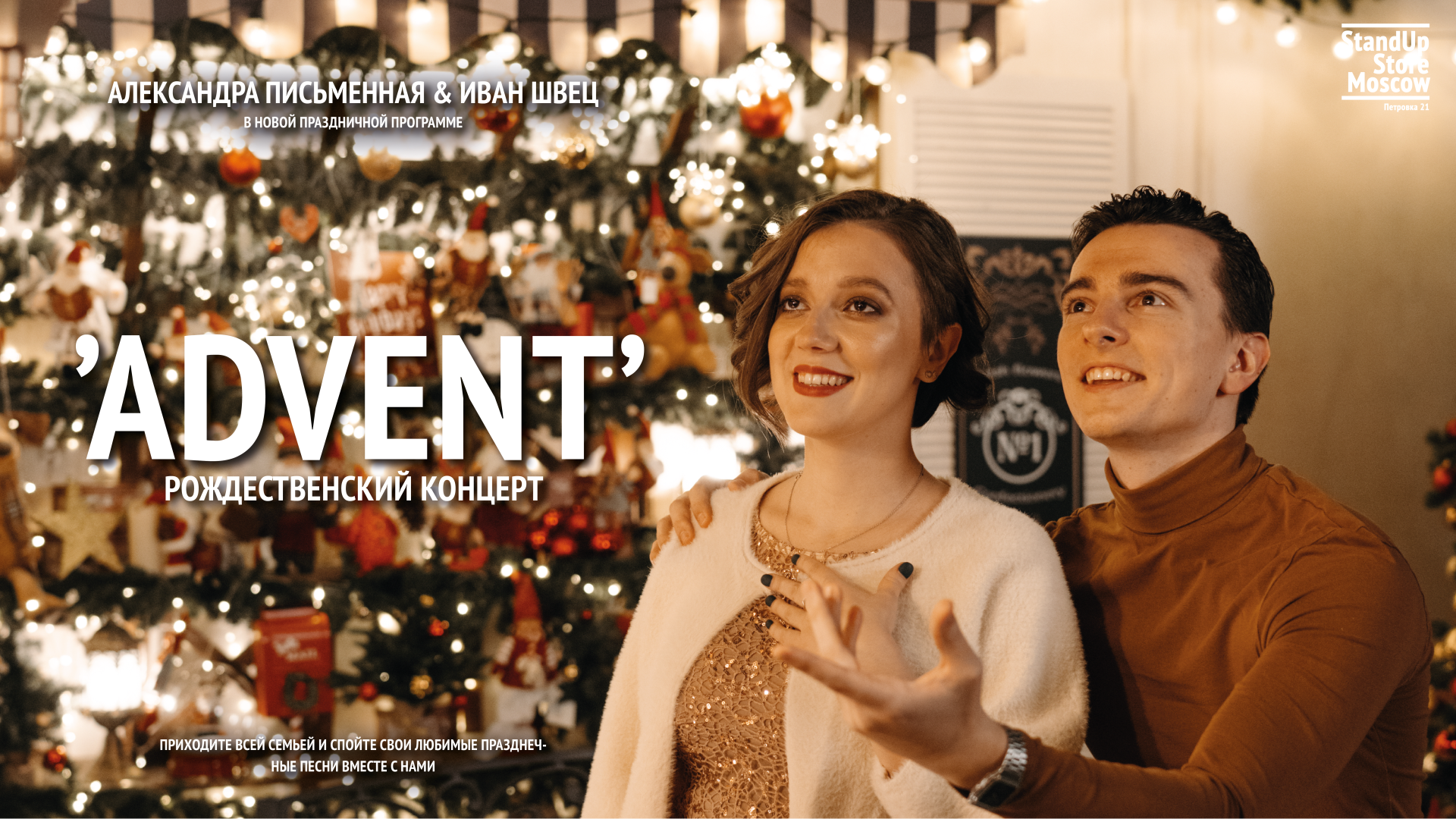 Александра Письменная & Иван Швец, приглашают Вас на праздничную, концертную программу “ADVENT”, которая пройдёт в субботу 26 декабря, в зале StandUp Store Moscow.
